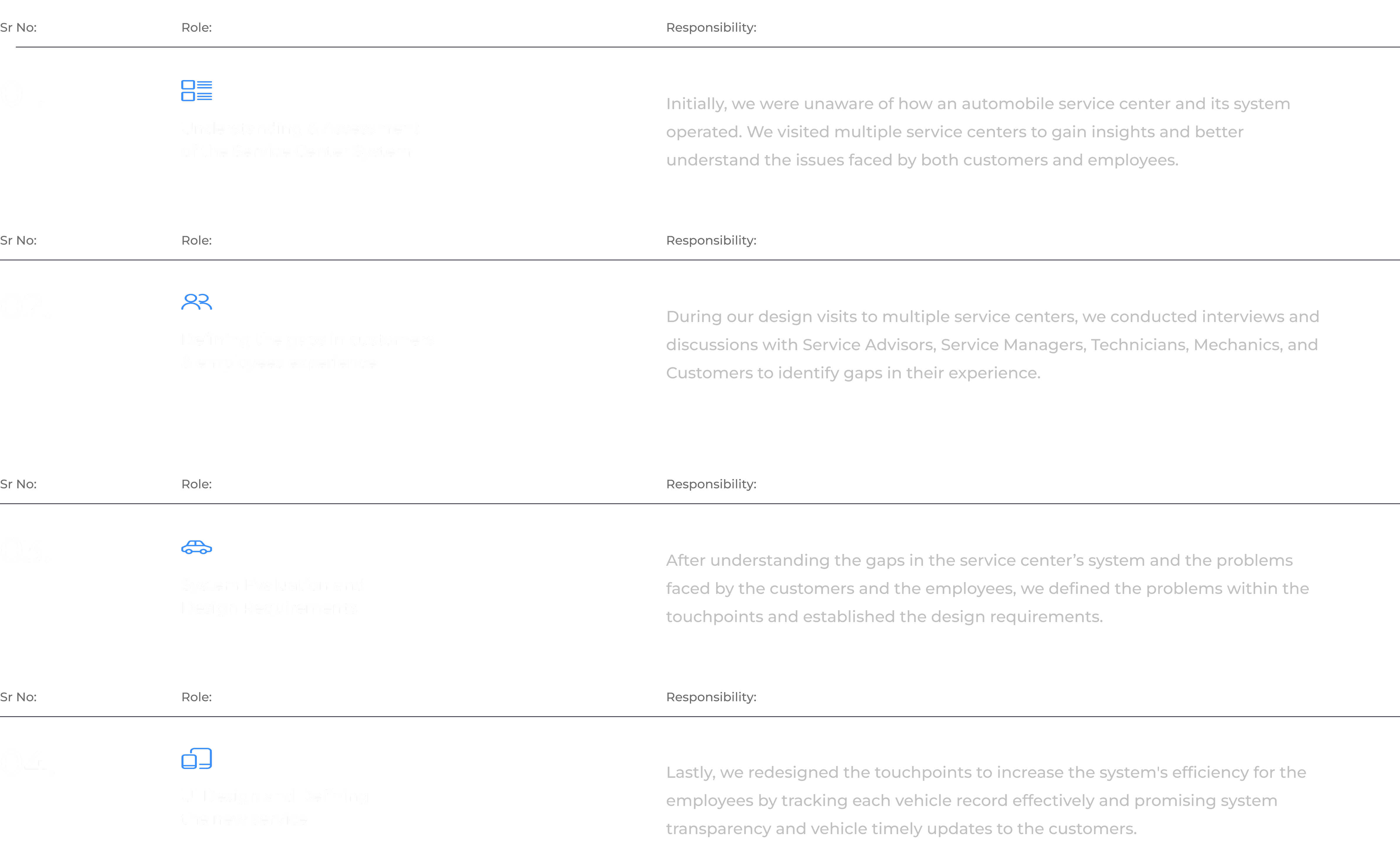 During our visits to multiple service centers we aimed to understand the gaps and problems faced by the customers and the employees at the service station. We focused on understanding how a service station works, different touchpoints and the opportunities to improve them.